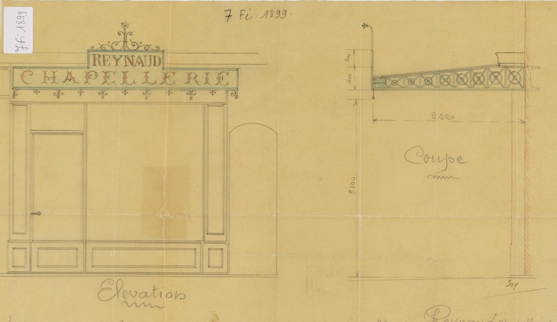 Depuis 1858 le magasin de gauche était occupé par une chapellerie. Successivement tenu par Gigay, Léon Tallard puis par Ange Marie Boillon, Gaston Reynaud la reprendra en 1898. L’autorisation de voirie pour la pose d’une marquise en 1903 était accompagnée du croquis ci-dessous.